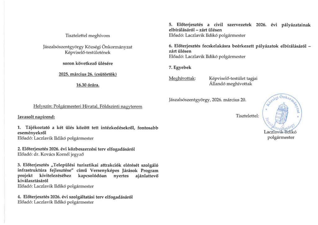 Meghívó a képviselő-testület ülésére 2026.03.26